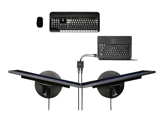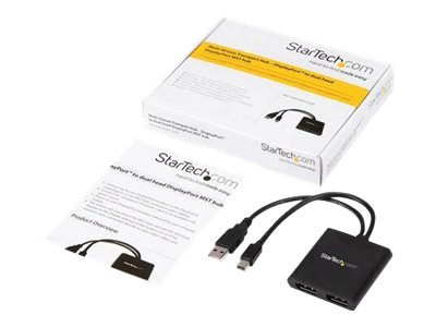 Med denna MST-hubb kan du ansluta två DisplayPort-skärmar till din Mini DisplayPort-dator. MST fungerar på alla Windows -enheter som stöder DisplayPort 1.2, som till exempel modeller av Lenovo Think Pad och Microsoft Surface . Vid anslutning till tidigare versioner av DisplayPort, som till exempel DP 1.1, fungerar MST-hubben som en videosplitter. MST-hubben är USB-driven så att det enda du behöver för att använda hubben är din dator.