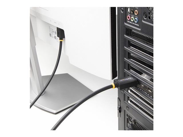Den 3 m långa DisplayPort 2.1-kabeln från StarTech.com är konstruerad för högpresterande anslutning med en rad avancerade funktioner. Den här kabeln stöder upplösningar upp till 8K vid 60 Hz, vilket garanterar bildkvalitet för högupplösta skärmar. Med kapacitet för 4K vid 144 Hz och 1440p vid 240 Hz uppfyller den kraven från spelare och designers, vilket ger smidiga visuella upplevelser utan fördröjning. Kabeln är byggd med en robust och skärmad design och har funktioner som avskärmning med aluminiummylarfolie, EMI-skydd och halogenfria material för säkrare användning. Detta gör den till ett pålitligt val för alla miljöer, oavsett om det är hemma eller i en professionell miljö. Dessutom möjliggör DisplayPort 2.1-specifikationen en dataöverföringshastighet på upp till 40 Gbps, vilket tillgodoser höga bandbreddsbehov för flera skärmar som är anslutna via en enda kabel. Med stöd för HDR, 32 ljudkanaler och kompatibilitet med tekniker som G-Sync och FreeSync förbättrar den här kabeln video- och ljudprestanda. För att säkerställa hållbarheten tål den upp till 10 000 instick och har en livslängd på 600 böjningar.