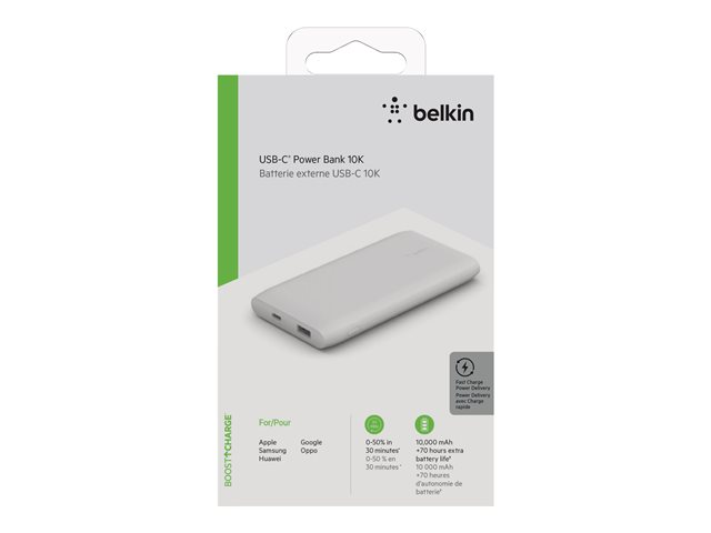 Belkin BoostCharge - Power bank - 10000 mAh - 18 Watt - Fast Charge, PD - 2 utdatakontakter (USB, USB-C) - vit BPB001BTWH