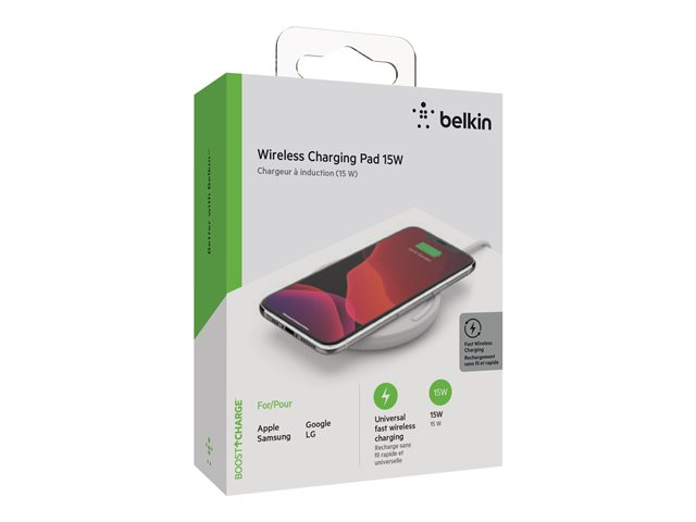 Belkin BoostCharge - Trådlös laddningsplatta + växelströmsadapter - 15 Watt - QC 3.0 - vit WIA002VFWH