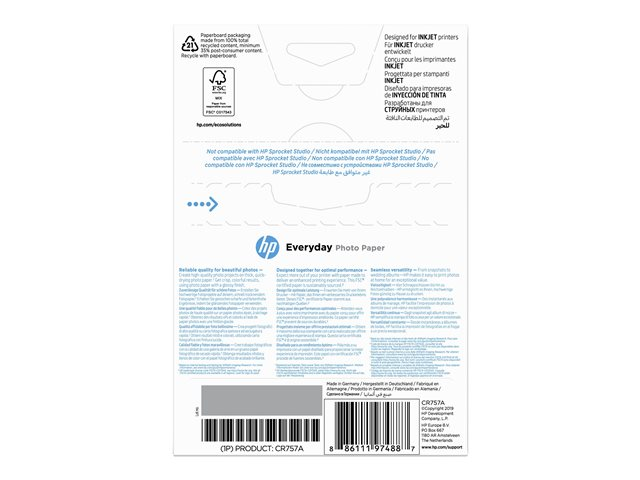 HP Everyday Photo Paper - Blank - 8 mil - 100 x 150 mm - 200 g/m² - 100 ark fotopapper - för Deskjet 21XX, 2622, 36XX; ENVY 5010; Officejet 52XX, 80XX; Photosmart B110, Wireless B110 CR757A